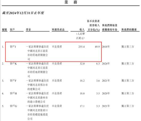 2022年、2023年及2024年,来自不良资产管理业务下最大客户的收入分别为0.92亿元、0.24亿元及2.5亿元,分别占不良资产经营收入的21.8%、10.7%及49.9%。
